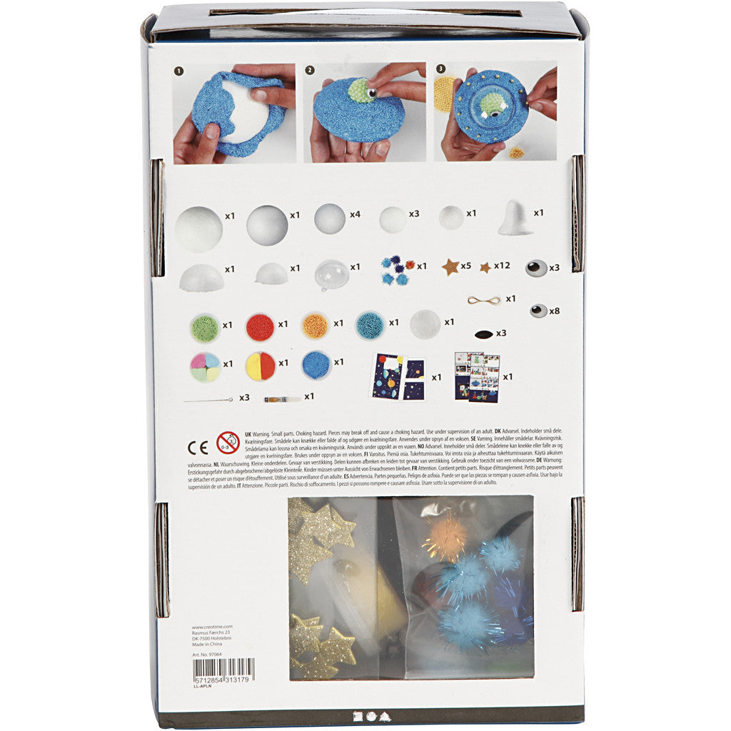Wer eine lebhafte Fantasie hat, dem wird nie langweilig. Eben noch ist man auf der Erde, und im nächsten Moment sucht man nach Leben auf dem Mars. Unsere Material-Sets mit Weltraummotiven machen es Groß und Klein ganz einfach, sich auf eine Reise in die Galaxie zu begeben. Vielleicht finden Sie ja neue unerforschte Planeten und lernen lustige kleine Aliens kennen, die in einem UFO umherfliegen – werden Sie kreativ und sehen Sie, was passiert.