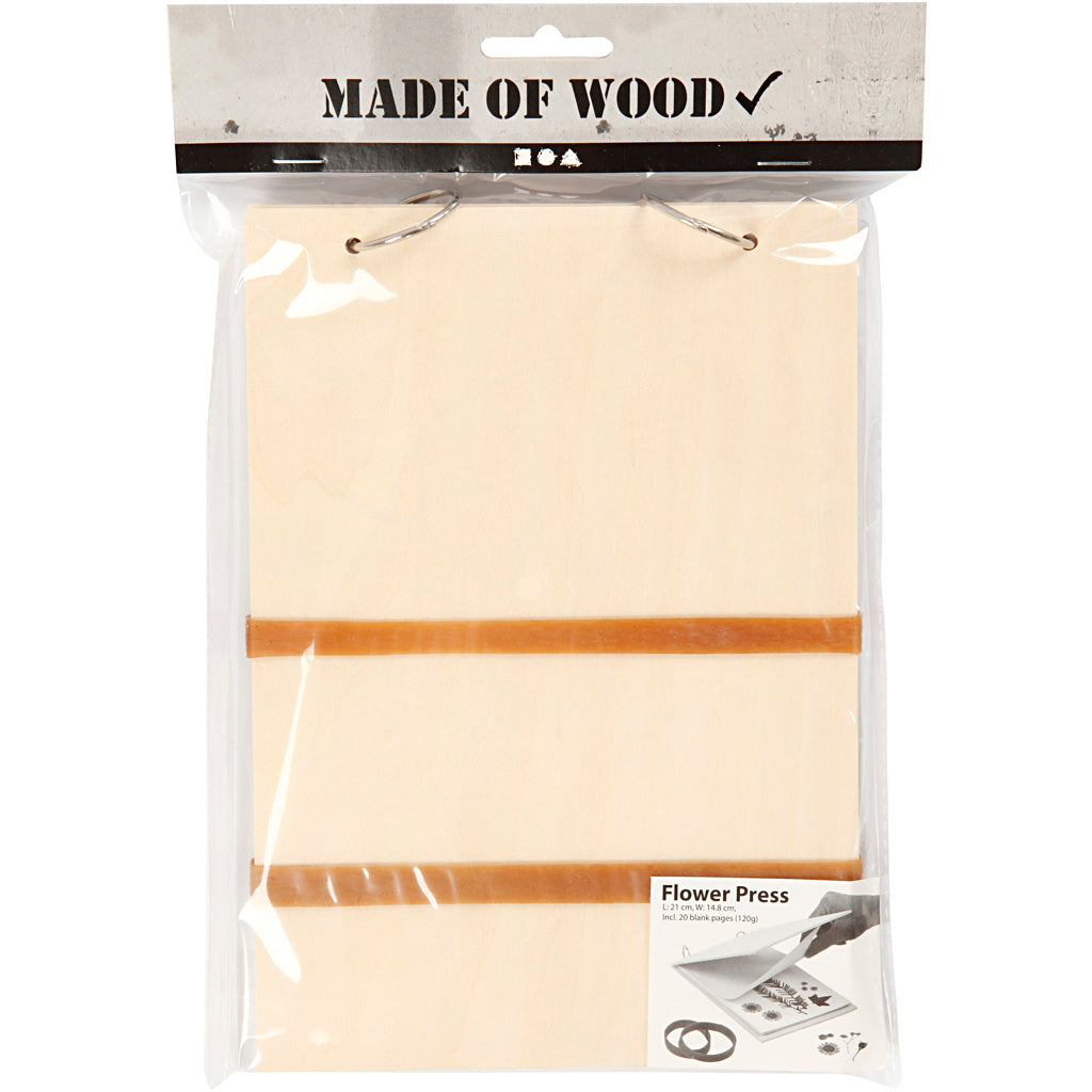 Blumenpresse aus hellem Holz mit verschließbaren Metallringen und 20 leeren Seiten (120 g) - inkl. zwei breiten Gummibändern, die für zusätzlichen Anpressdruck um die Presse gelegt werden können.