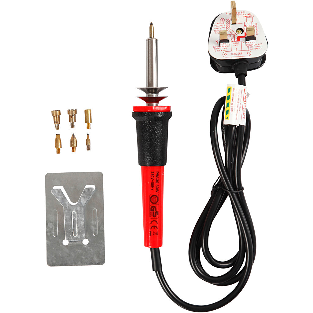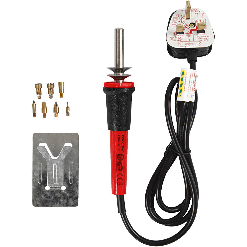 Elektrowerkzeug mit auswechselbarer, glühender Metallspitze zum Einbrennen von Schrift und Motiven in Kork, Leder und Holz. Ständer und Glühnadeln für Motive und Freihandzeichnungen sind im Set enthalten.