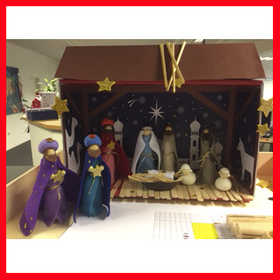 Inhalt: Silk Clay, Filz, Kleiderclips mit Stopper, Leinen, Bast, Stroh, Eiszapfen, Strasssteine, Moosgummifiguren, Pailletten, Schnur, Glitzerkleber, Kleber, Klebeband, Hintergrund für das Krippenspiel und Schablonen