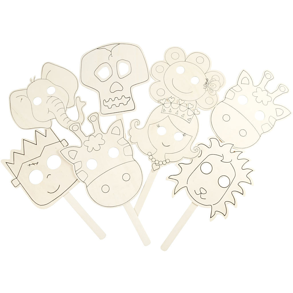 Holzmasken mit Augenschlitzen, Griff und aufgemalten Details. Packung mit 8 verschd. Designs á 2 Stück. Zum bemalen mit Plus Color-Bastelfarbe, Acryl-Markern etc.