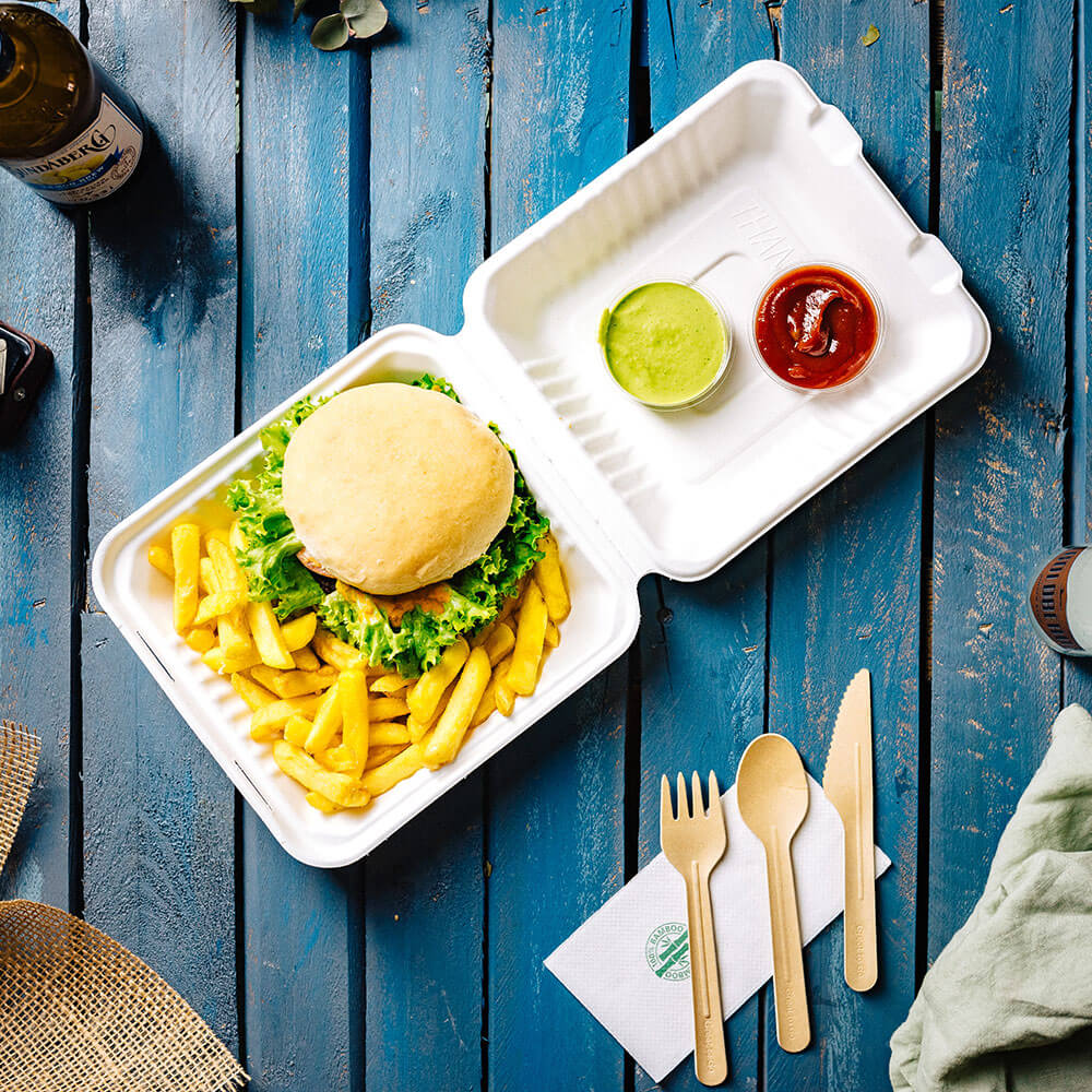 Take-away in robusten Schalen: Die Schalen sind besonders für Fast Food und Fingerfood geeignet. Auch fetthaltige Speisen wie gebratene Knödel lassen sich sicher verpacken. Da die Schalen aus Zuckerrohr gefertigt sind, sind sie bereits von sich aus robust und benötigen daher keinen zusätzlichen Schutz durch eine Beschichtung.