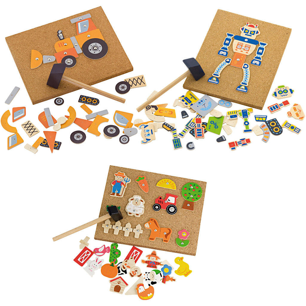 Hammer-Mosaik-Set mit bemalten Holzteilen, die passend zu den beiliegenden Bildkarten oder frei nach eigener Fantasie zusammengestellt werden können. Fördert die Beobachtungsgabe, Vorstellungskraft, Kreativität und Hand-Auge-Koordination der Kinder