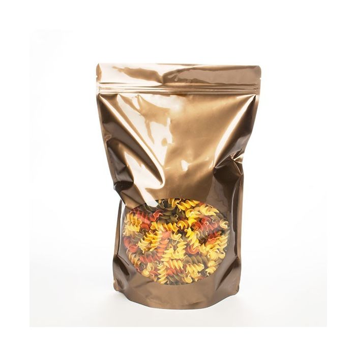 Es gibt keinen besseren Weg, um Ihre Produkte sichtbar zu machen, als mit einer strahlenden Verpackung. Die Standbodenbeutel mit rundem Fenster ZBGO6BZ sind Teil unserer Linie von wiederverschließbaren Standbodenbeuteln mit Druckverschluss. Das glänzende bronze Material erregt sofort die Aufmerksamkeit Ihrer Kunden. Außerdem bleiben die Beutel aufrecht stehen, wenn sie befüllt sind. Dies ermöglicht eine stilvolle Präsentation Ihrer Produkte!
