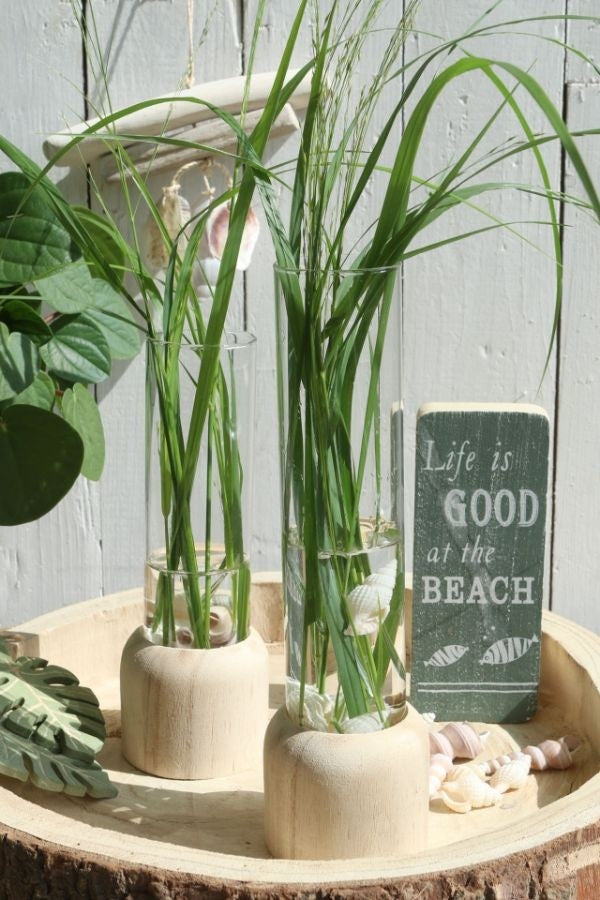 Diese hochwertigen Holzsockel werden mit einem transparenten Reagenzglas geliefert. Der Holzsockel mit Vase ist perfekt für eine einzelne Blume oder ein kleines Blumenarrangement. Entscheiden Sie sich für einen klassischen Look mit einem einzelnen Glas oder kaufen Sie 3 oder 4 Stück, um zum Beispiel Ihren Tisch oder Schrank zu dekorieren. Lassen Sie Ihrer Kreativität freien Lauf!