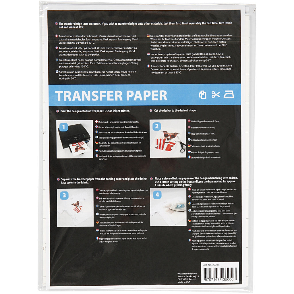 Spezialfolien mit gummiartiger Oberfläche, die mit Stofffarbe und Stoffmalstiften dekoriert oder mit einem Tintenstrahl-oder Laserdrucker bedruckt werden können. Die Folie kann mit der Schere geschnitten werden. Legen Sie das Motiv mit der Oberseite nach oben auf den Stoff, decken Sie es mit einem Stück Backpapier ab und bügeln Sie das Motiv auf einer ebenen Fläche auf. Bitte beachten Sie, dass bei der Verwendung von Transfer-Bügelfolie für helle Textilien (207010) das Motiv stattdessen nach unten zeigen und das Trägerpapier auf der Rückseite der Folie ganz zum Schluss entfernt werden muss.